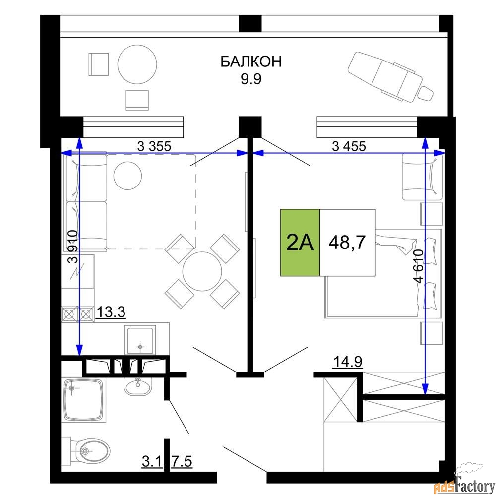 Жилая площадь 14.9 м2, кухня 13.3 м2, чистовая отделка с мебелью.
