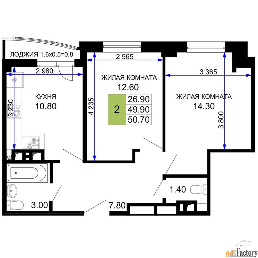 Жилая площадь 26.9 м2, кухня 10.8 м2, предчистовая отделка.
