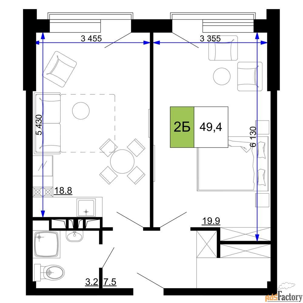 Жилая площадь 19.9 м2, кухня 18.8 м2, чистовая отделка с мебелью.