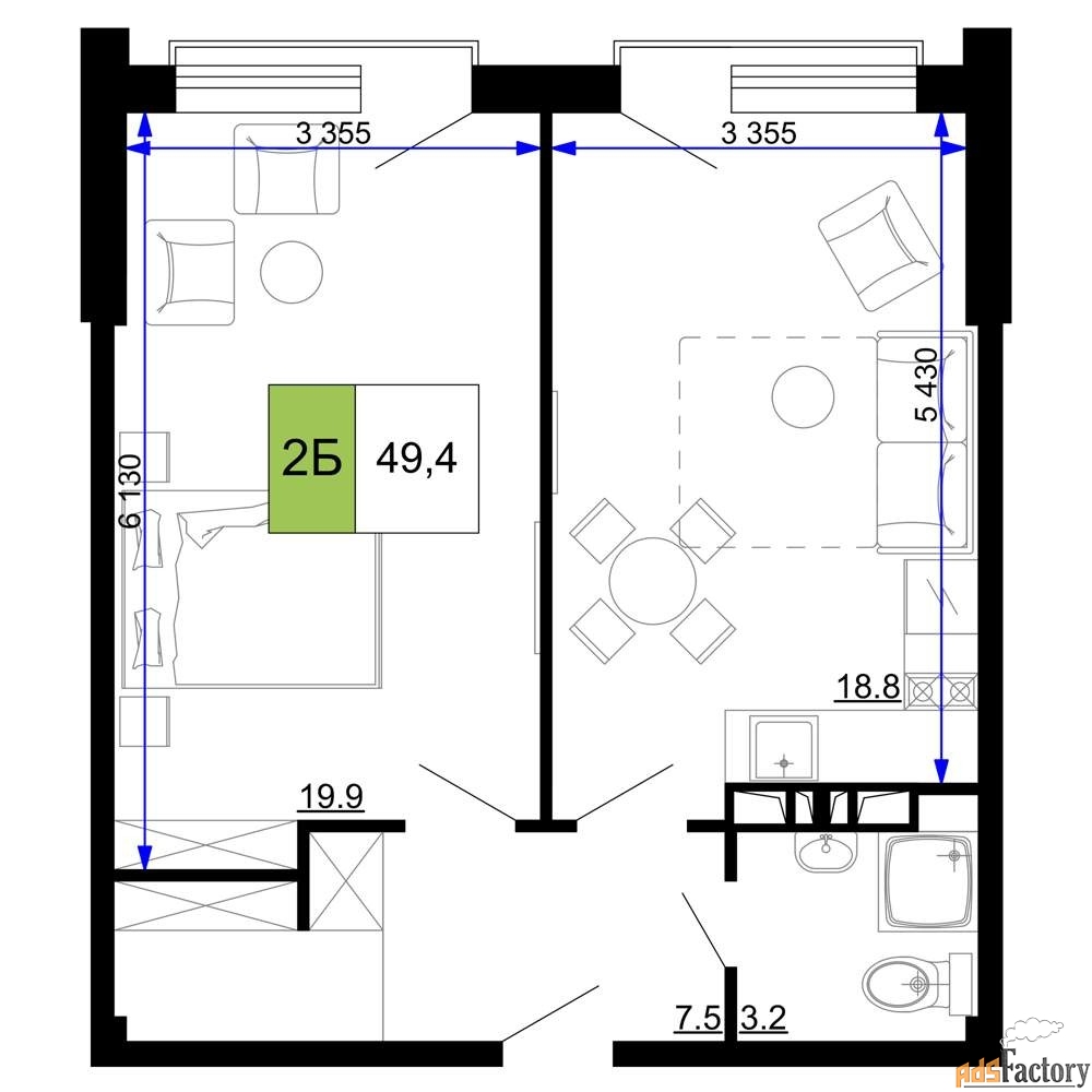 Жилая площадь 19.9 м2, кухня 18.8 м2, чистовая отделка с мебелью.