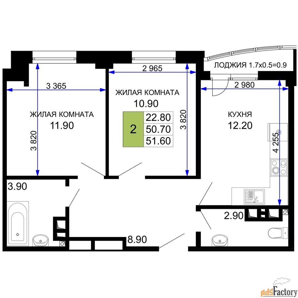Жилая площадь 22.8 м2, кухня 12.2 м2, предчистовая отделка.