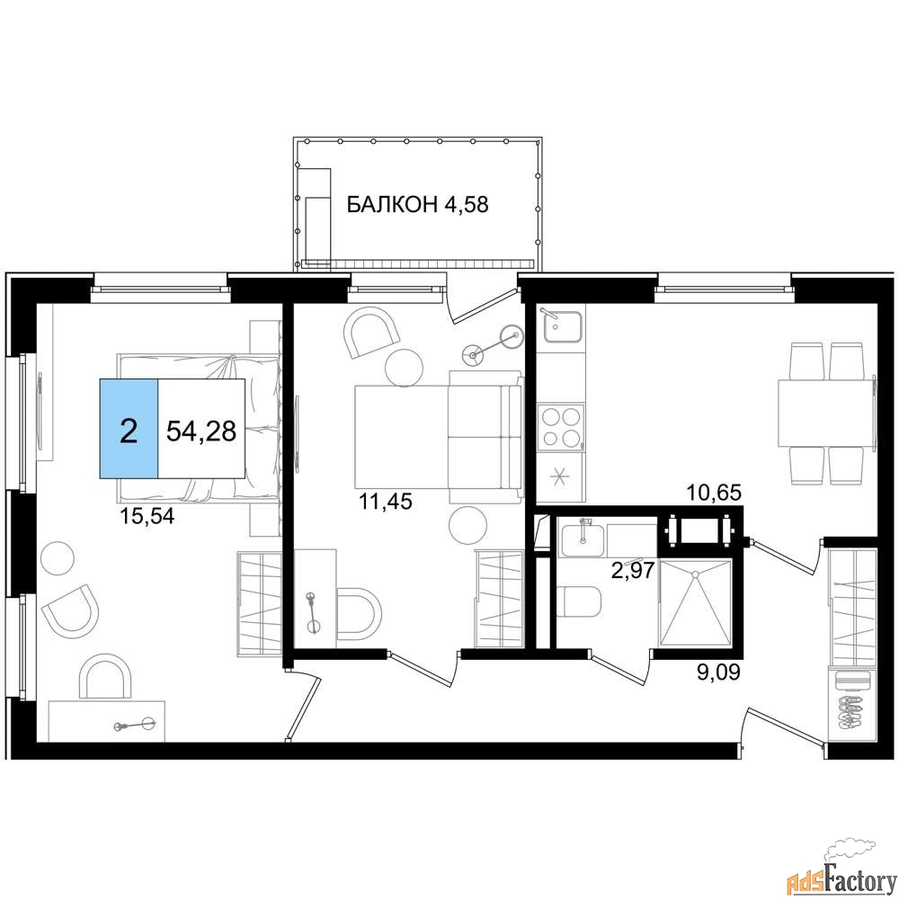 Жилая площадь 41.45 м2, кухня 10.65 м2, чистовая отделка с мебелью.