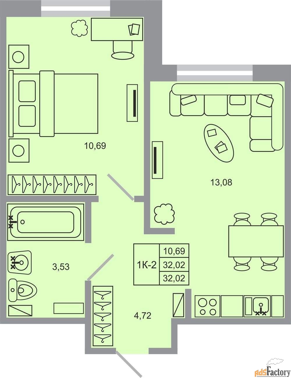 Жилая площадь 10.69 м2, кухня 13.08 м2, чистовая отделка, комнаты изолированные.