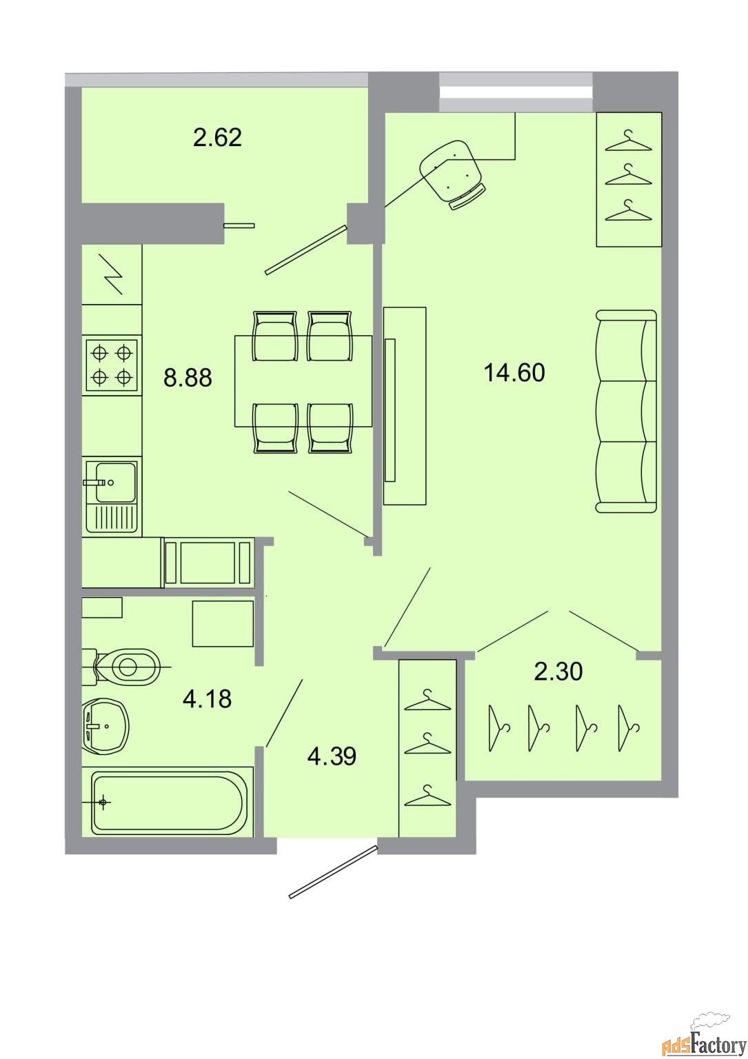 Жилая площадь 16.6 м2, кухня 8.6 м2, чистовая отделка, комнаты изолированные, лоджий - 1.