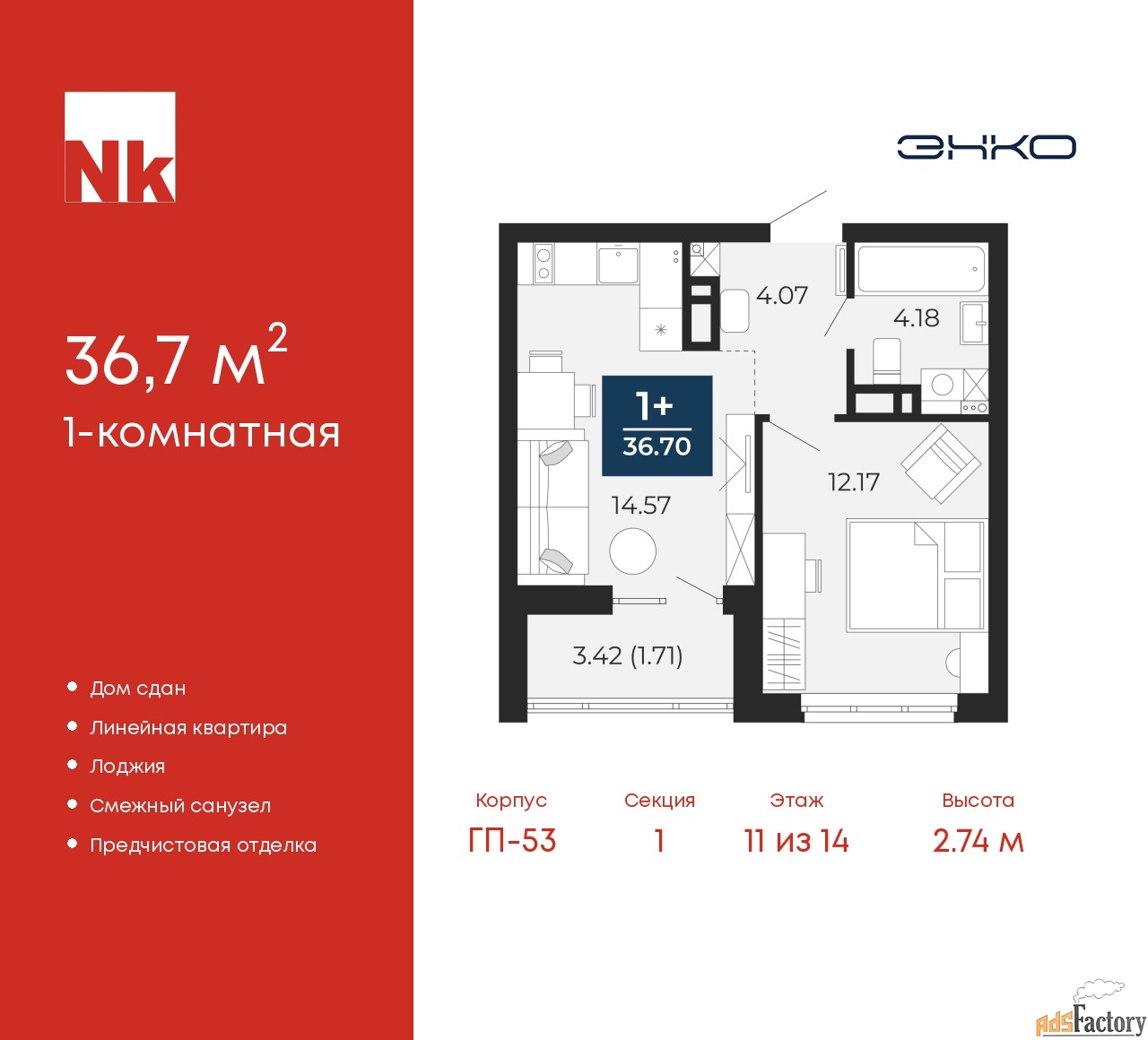 Дом монолитный, многоподъездный, переменной этажности, от 12 до 17 этажей. Квартира находится в 1-й секции высотой 14 этажей в корпусе ГП-53. На этаже 8 квартир. В подъезде 1 пассажирский и 1 грузовой лифт. В настоящее время строительство завершено, дом сдан в 4 квартале 2022 года. Оформление сделки по договору купли-продажи.