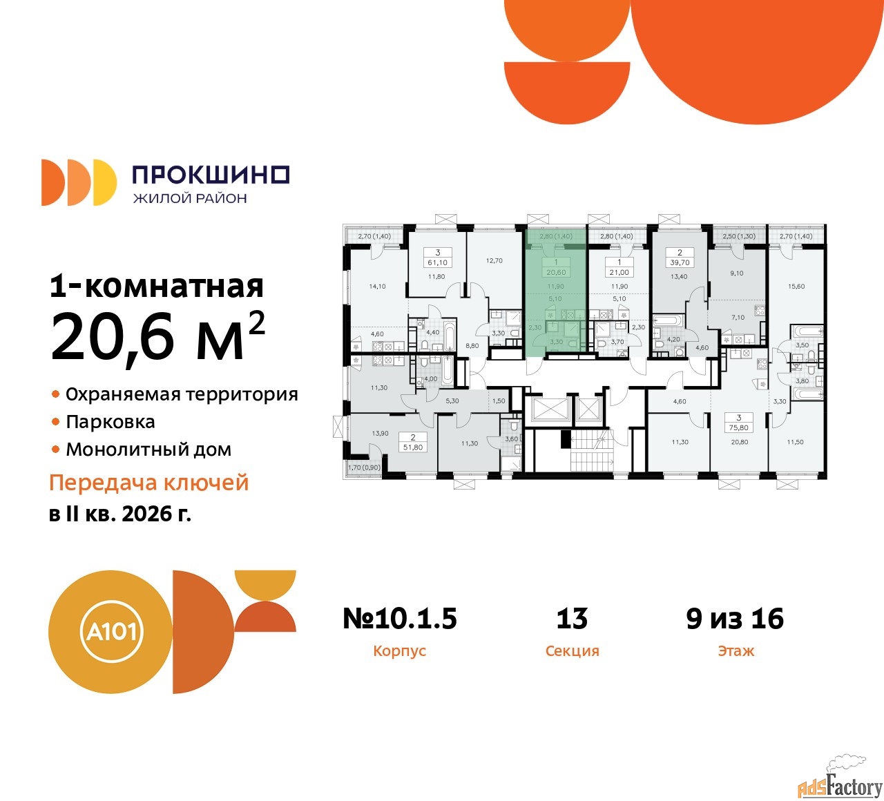 Дом монолитный, многоподъездный, переменной этажности, от 7 до 16 этажей. Квартира находится в 1-й секции высотой 16 этажей в корпусе 10.1.5. На этаже 6 квартир. В подъезде 1 пассажирский и 1 грузовой лифт. Начало строительства - 2 квартал 2023 года. Окончание строительства - 2 квартал 2026 года. Оформление сделки по договору долевого участия.