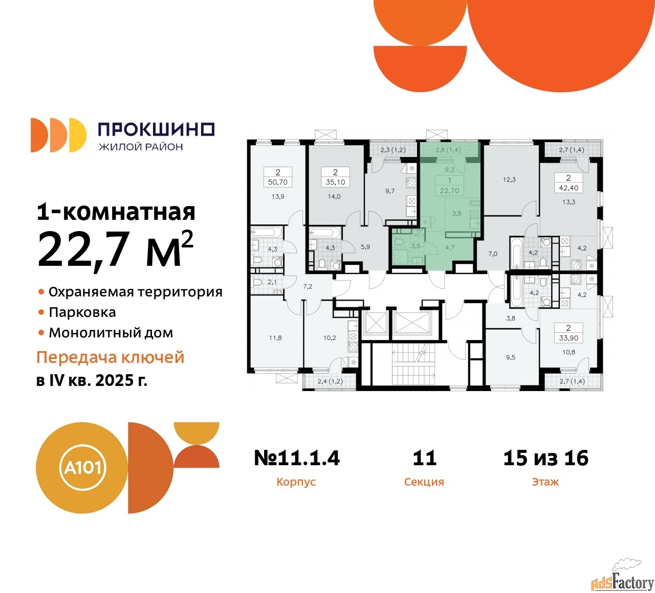 Дом монолитный, многоподъездный, переменной этажности, от 12 до 16 этажей. Квартира находится в 6-й секции высотой 16 этажей в корпусе 11.1.4. На этаже 5 квартир. В подъезде 1 пассажирский и 1 грузовой лифт. Начало строительства - 3 квартал 2023 года. Окончание строительства - 4 квартал 2025 года. Оформление сделки по договору долевого участия.