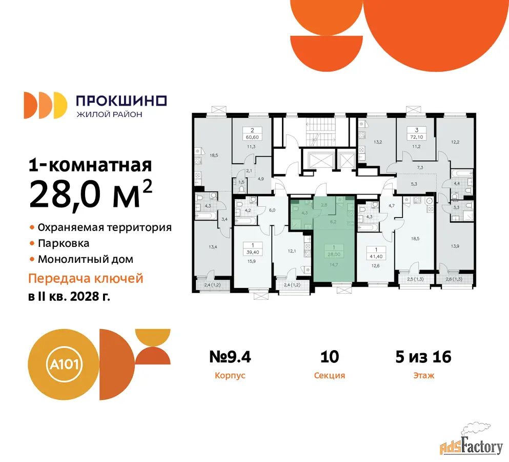 Дом монолитный, черырехподъездный, переменной этажности, от 10 до 16 этажей. Квартира находится в 3-й секции высотой 13 этажей в корпусе 9.4. На этаже 5 квартир. В подъезде 1 пассажирский и 1 грузовой лифт. Начало строительства - 3 квартал 2025 года. Окончание строительства - 4 квартал 2027 года. Оформление сделки по договору долевого участия.