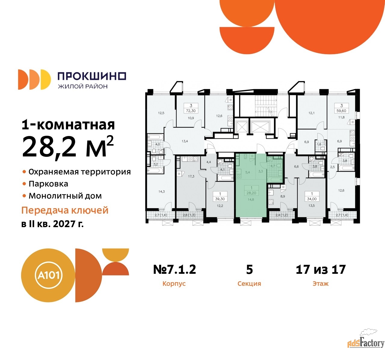 Дом монолитный, трехподъездный, переменной этажности, от 12 до 17 этажей. Квартира находится во 2-й секции высотой 17 этажей в корпусе 7.1.2. На этаже 5 квартир. В подъезде 1 пассажирский и 1 грузовой лифт. Начало строительства - 4 квартал 2024 года. Окончание строительства - 2 квартал 2027 года. Оформление сделки по договору долевого участия.
