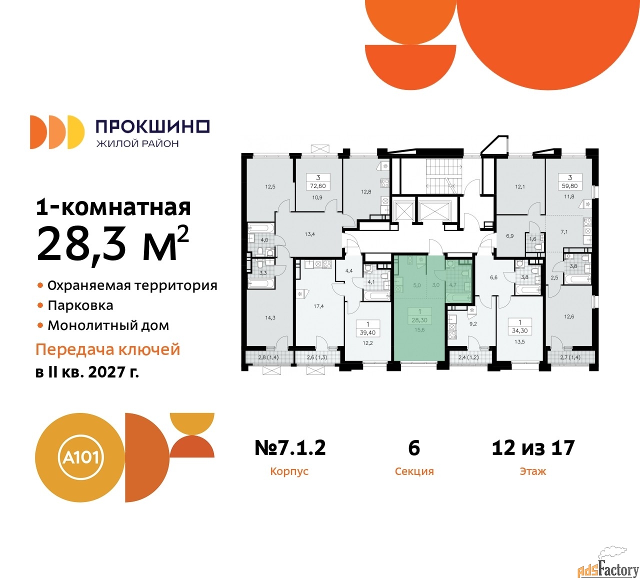 Дом монолитный, трехподъездный, переменной этажности, от 12 до 17 этажей. Квартира находится в 3-й секции высотой 12 этажей в корпусе 7.1.2. На этаже 5 квартир. В подъезде 1 пассажирский и 1 грузовой лифт. Начало строительства - 4 квартал 2024 года. Окончание строительства - 2 квартал 2027 года. Оформление сделки по договору долевого участия.