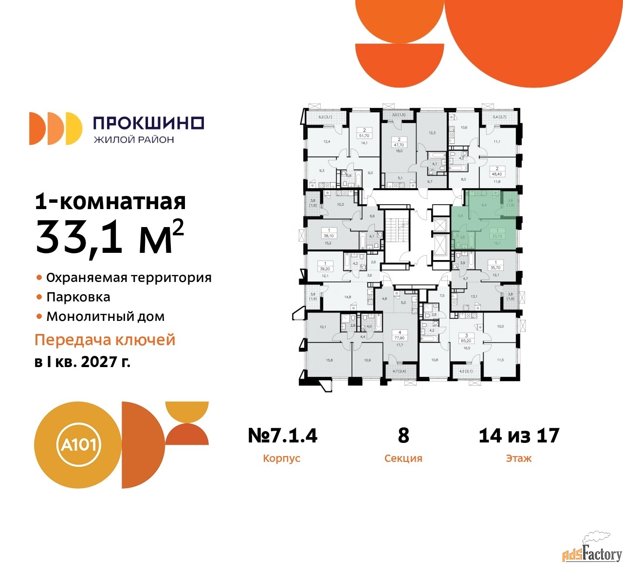 Квартира находится в корпусе 7.1.4. Дом монолитный, одноподъездный, высотой 17 этажей. На этаже 9 квартир. В подъезде 1 пассажирский и 1 грузовой лифт. Начало строительства - 4 квартал 2024 года. Окончание строительства - 1 квартал 2027 года. Оформление сделки по договору долевого участия.