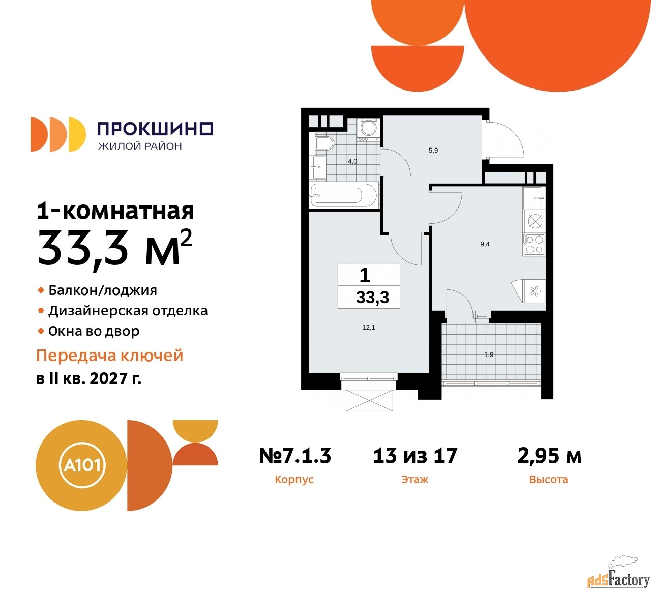 Квартира находится в корпусе 7.1.3. Дом монолитный, одноподъездный, высотой 17 этажей. На этаже 9 квартир. В подъезде 1 пассажирский и 1 грузовой лифт. Начало строительства - 4 квартал 2024 года. Окончание строительства - 2 квартал 2027 года. Оформление сделки по договору долевого участия.