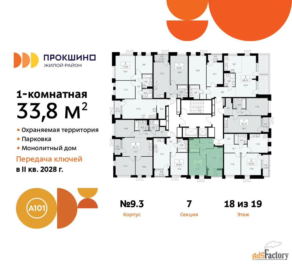Квартира находится в корпусе 9.3. Дом монолитный, одноподъездный, высотой 19 этажей. На этаже 9 квартир. В подъезде 1 пассажирский и 1 грузовой лифт. Начало строительства - 3 квартал 2025 года. Окончание строительства - 4 квартал 2027 года. Оформление сделки по договору долевого участия.