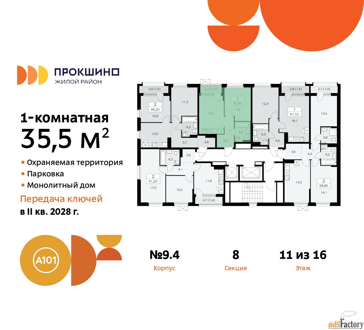 Дом монолитный, черырехподъездный, переменной этажности, от 10 до 16 этажей. Квартира находится в 1-й секции высотой 16 этажей в корпусе 9.4. На этаже 5 квартир. В подъезде 1 пассажирский и 1 грузовой лифт. Начало строительства - 3 квартал 2025 года. Окончание строительства - 4 квартал 2027 года. Оформление сделки по договору долевого участия.