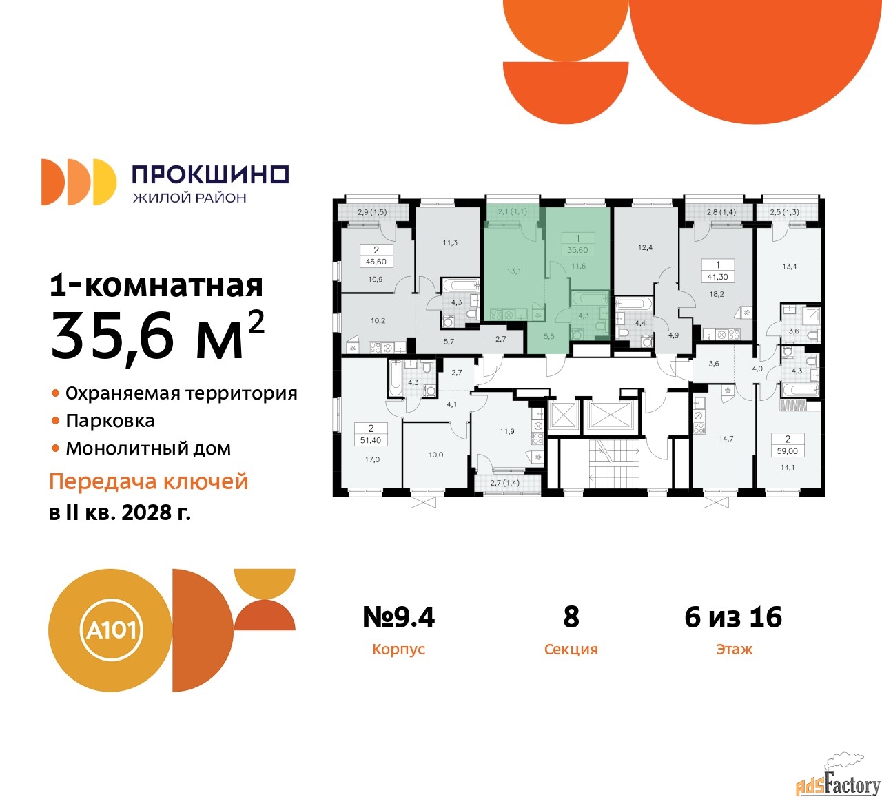Дом монолитный, черырехподъездный, переменной этажности, от 10 до 16 этажей. Квартира находится в 1-й секции высотой 16 этажей в корпусе 9.4. На этаже 5 квартир. В подъезде 1 пассажирский и 1 грузовой лифт. Начало строительства - 3 квартал 2025 года. Окончание строительства - 4 квартал 2027 года. Оформление сделки по договору долевого участия.