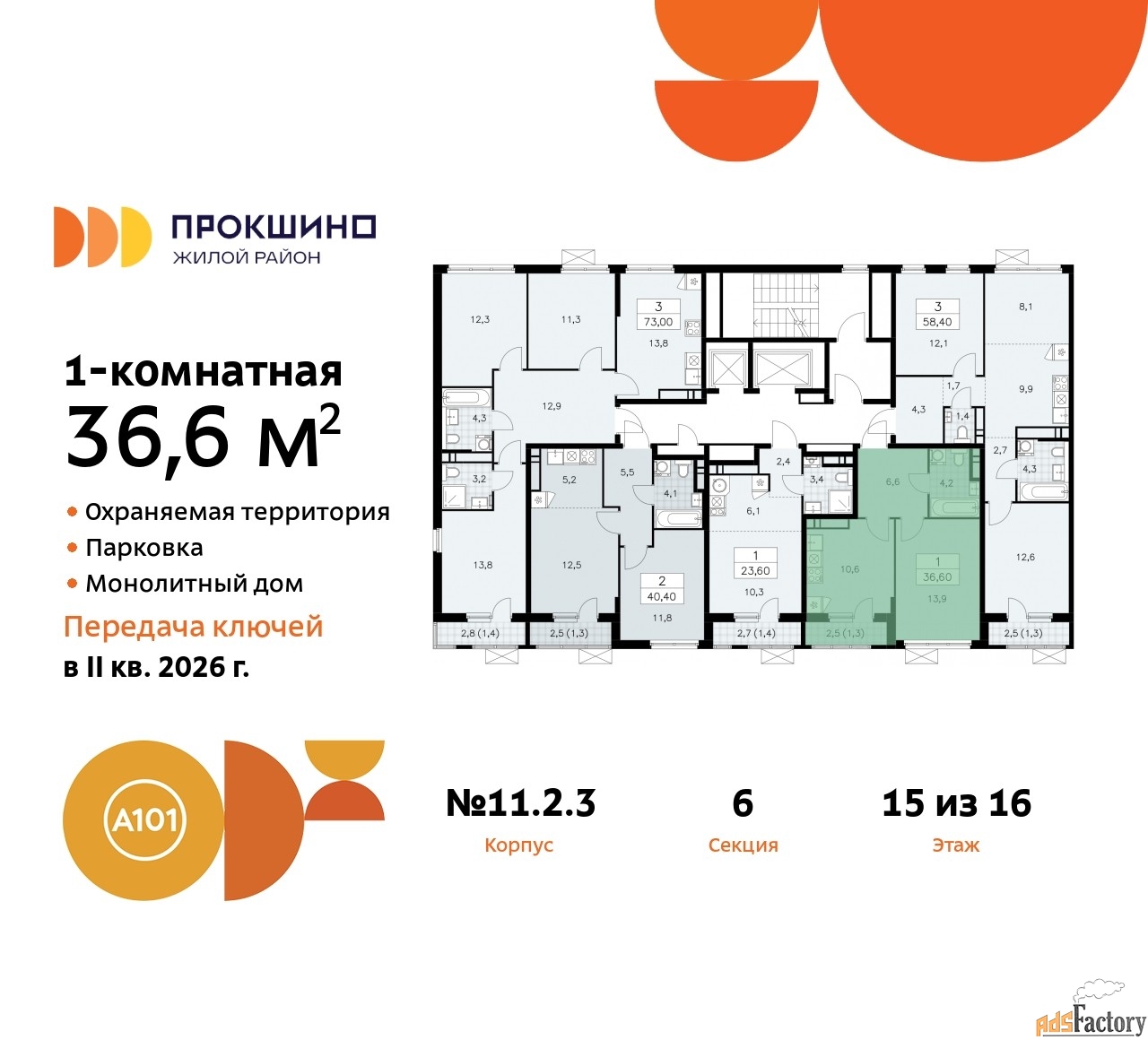 Дом монолитный, многоподъездный, переменной этажности, от 13 до 16 этажей. Квартира находится в 1-й секции высотой 16 этажей в корпусе 11.2.3. На этаже 5 квартир. В подъезде 1 пассажирский и 1 грузовой лифт. Начало строительства - 3 квартал 2023 года. Окончание строительства - 2 квартал 2026 года. Оформление сделки по договору долевого участия.