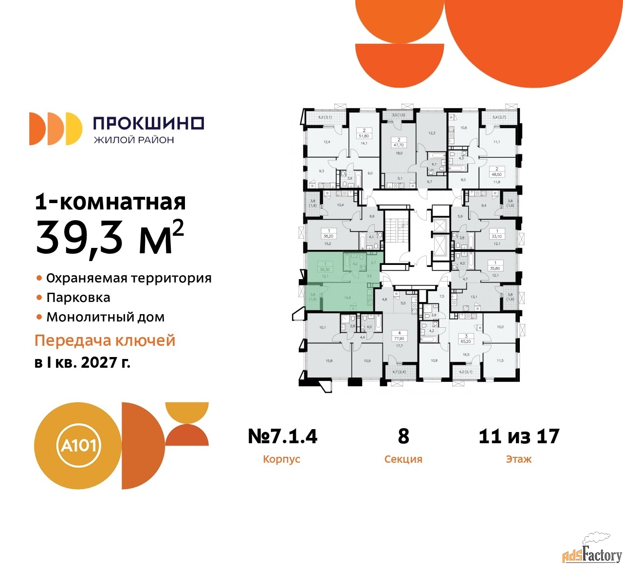 Квартира находится в корпусе 7.1.4. Дом монолитный, одноподъездный, высотой 17 этажей. На этаже 9 квартир. В подъезде 1 пассажирский и 1 грузовой лифт. Начало строительства - 4 квартал 2024 года. Окончание строительства - 1 квартал 2027 года. Оформление сделки по договору долевого участия.