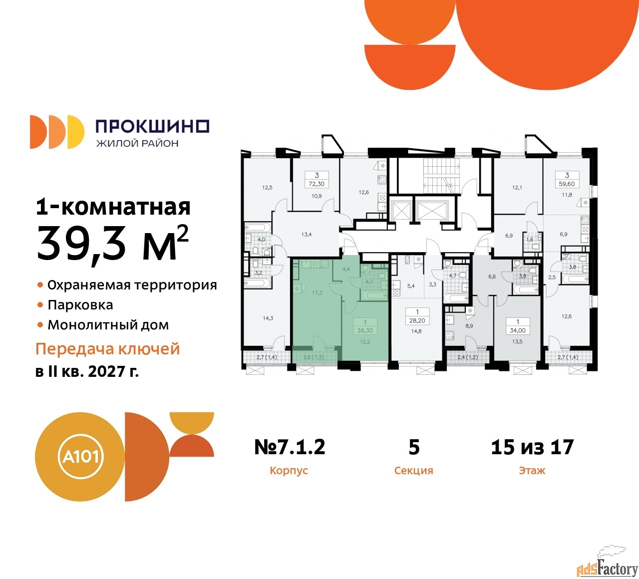Дом монолитный, трехподъездный, переменной этажности, от 12 до 17 этажей. Квартира находится во 2-й секции высотой 17 этажей в корпусе 7.1.2. На этаже 5 квартир. В подъезде 1 пассажирский и 1 грузовой лифт. Начало строительства - 4 квартал 2024 года. Окончание строительства - 2 квартал 2027 года. Оформление сделки по договору долевого участия.