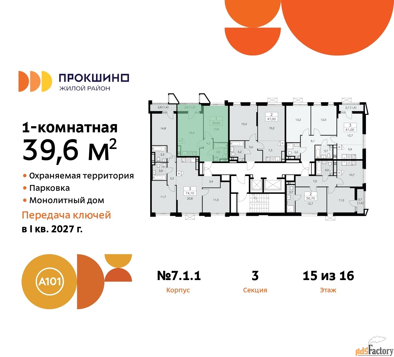 Дом монолитный, трехподъездный, переменной этажности, от 12 до 16 этажей. Квартира находится в 3-й секции высотой 16 этажей в корпусе 7.1.1. На этаже 5 квартир. В подъезде 1 пассажирский и 1 грузовой лифт. Начало строительства - 4 квартал 2024 года. Окончание строительства - 1 квартал 2027 года. Оформление сделки по договору долевого участия.