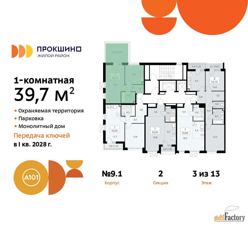 Дом монолитный, двухподъездный, высотой 13 этажей. Квартира находится во 2-й секции в корпусе 9.1. На этаже 5 квартир. В подъезде 1 пассажирский и 1 грузовой лифт. Начало строительства - 3 квартал 2025 года. Окончание строительства - 4 квартал 2027 года. Оформление сделки по договору долевого участия.