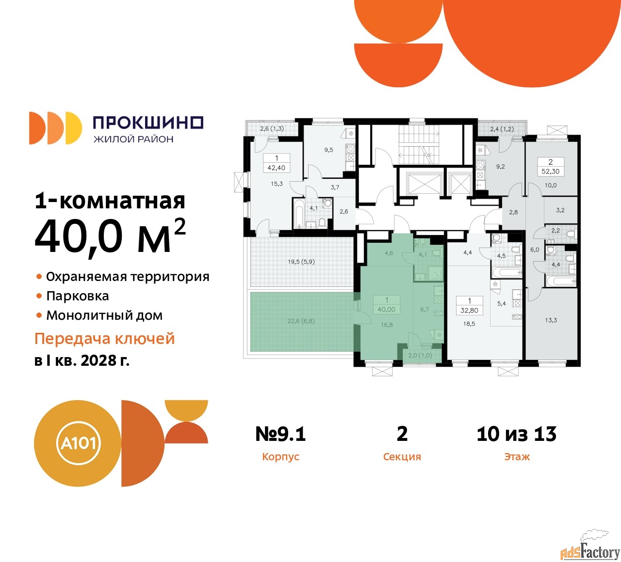 Дом монолитный, двухподъездный, высотой 13 этажей. Квартира находится во 2-й секции в корпусе 9.1. На этаже 5 квартир. В подъезде 1 пассажирский и 1 грузовой лифт. Начало строительства - 3 квартал 2025 года. Окончание строительства - 4 квартал 2027 года. Оформление сделки по договору долевого участия.