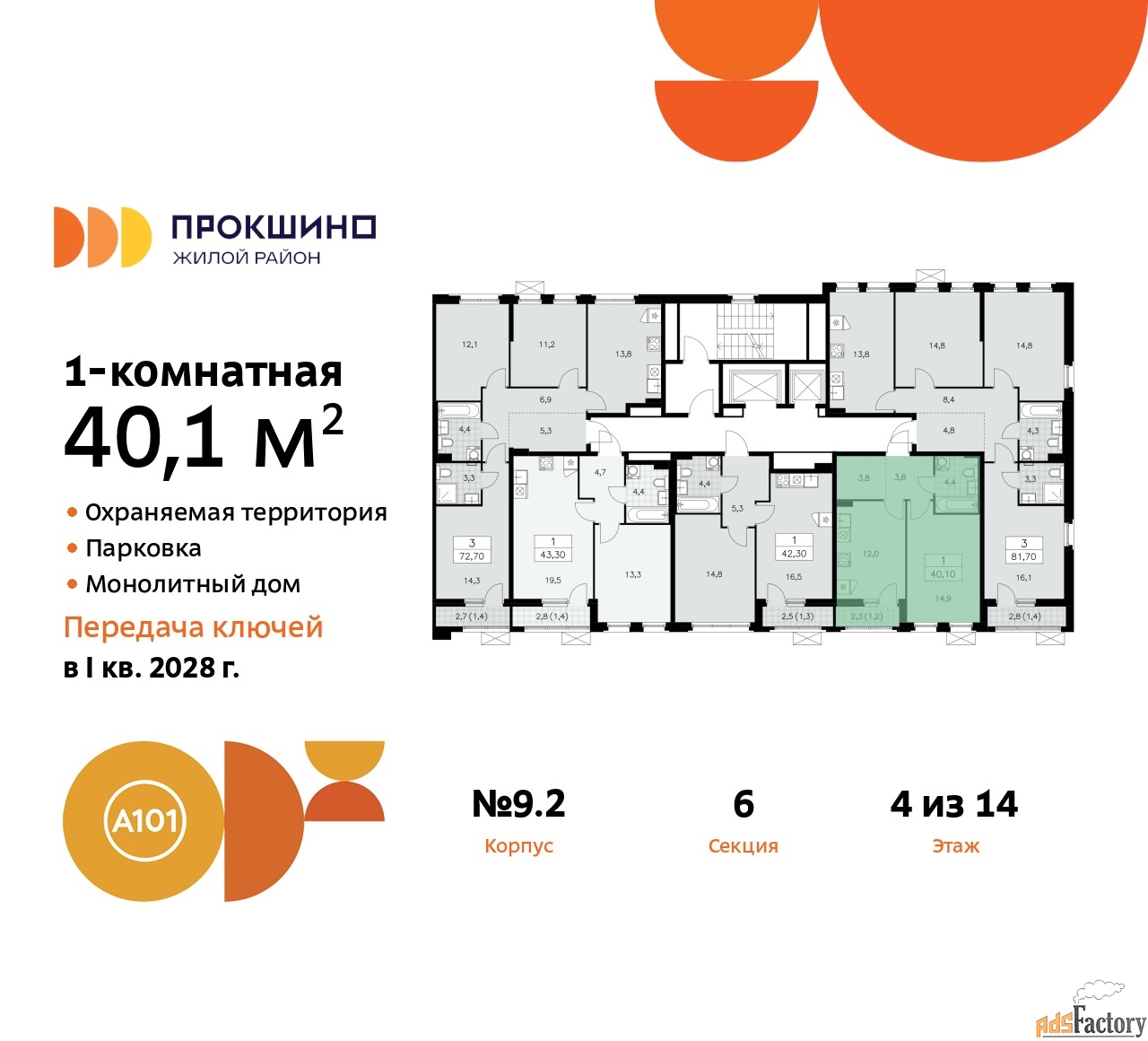 Дом монолитный, черырехподъездный, переменной этажности, от 10 до 14 этажей. Квартира находится в 4-й секции высотой 10 этажей в корпусе 9.2. На этаже 5 квартир. В подъезде 1 пассажирский и 1 грузовой лифт. Начало строительства - 3 квартал 2025 года. Окончание строительства - 4 квартал 2027 года. Оформление сделки по договору долевого участия.