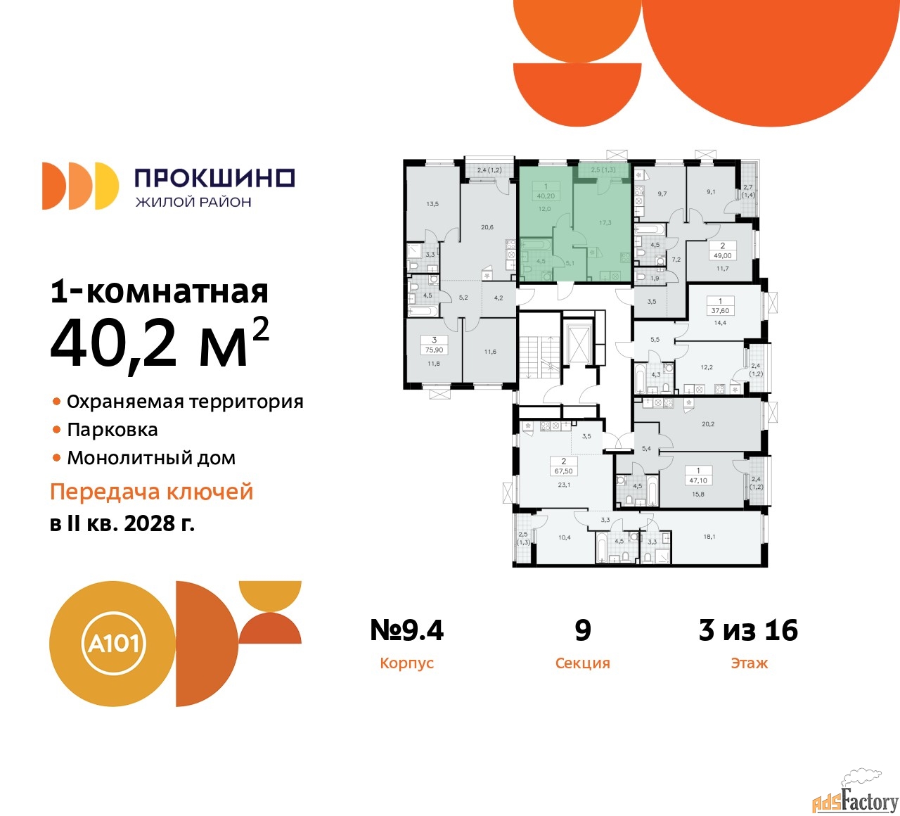 Дом монолитный, черырехподъездный, переменной этажности, от 10 до 16 этажей. Квартира находится во 2-й секции высотой 10 этажей в корпусе 9.4. На этаже 6 квартир. В подъезде 1 грузовой лифт. Начало строительства - 3 квартал 2025 года. Окончание строительства - 4 квартал 2027 года. Оформление сделки по договору долевого участия.