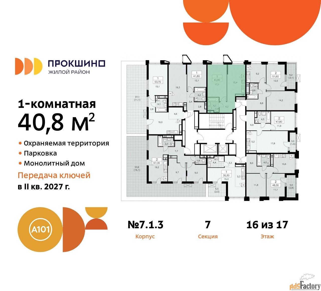 Квартира находится в корпусе 7.1.3. Дом монолитный, одноподъездный, высотой 17 этажей. На этаже 9 квартир. В подъезде 1 пассажирский и 1 грузовой лифт. Начало строительства - 4 квартал 2024 года. Окончание строительства - 2 квартал 2027 года. Оформление сделки по договору долевого участия.