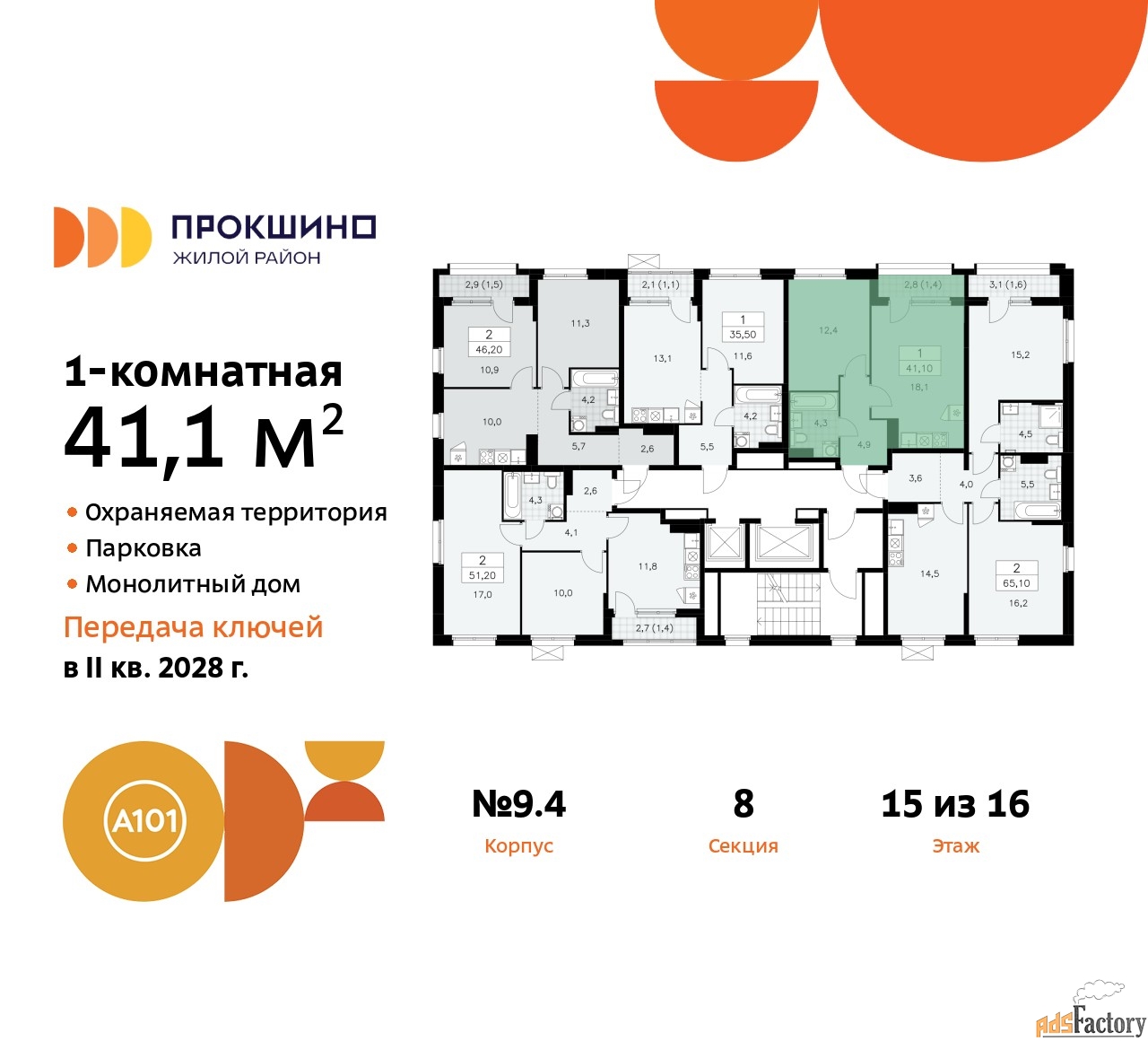 Дом монолитный, черырехподъездный, переменной этажности, от 10 до 16 этажей. Квартира находится в 1-й секции высотой 16 этажей в корпусе 9.4. На этаже 5 квартир. В подъезде 1 пассажирский и 1 грузовой лифт. Начало строительства - 3 квартал 2025 года. Окончание строительства - 4 квартал 2027 года. Оформление сделки по договору долевого участия.