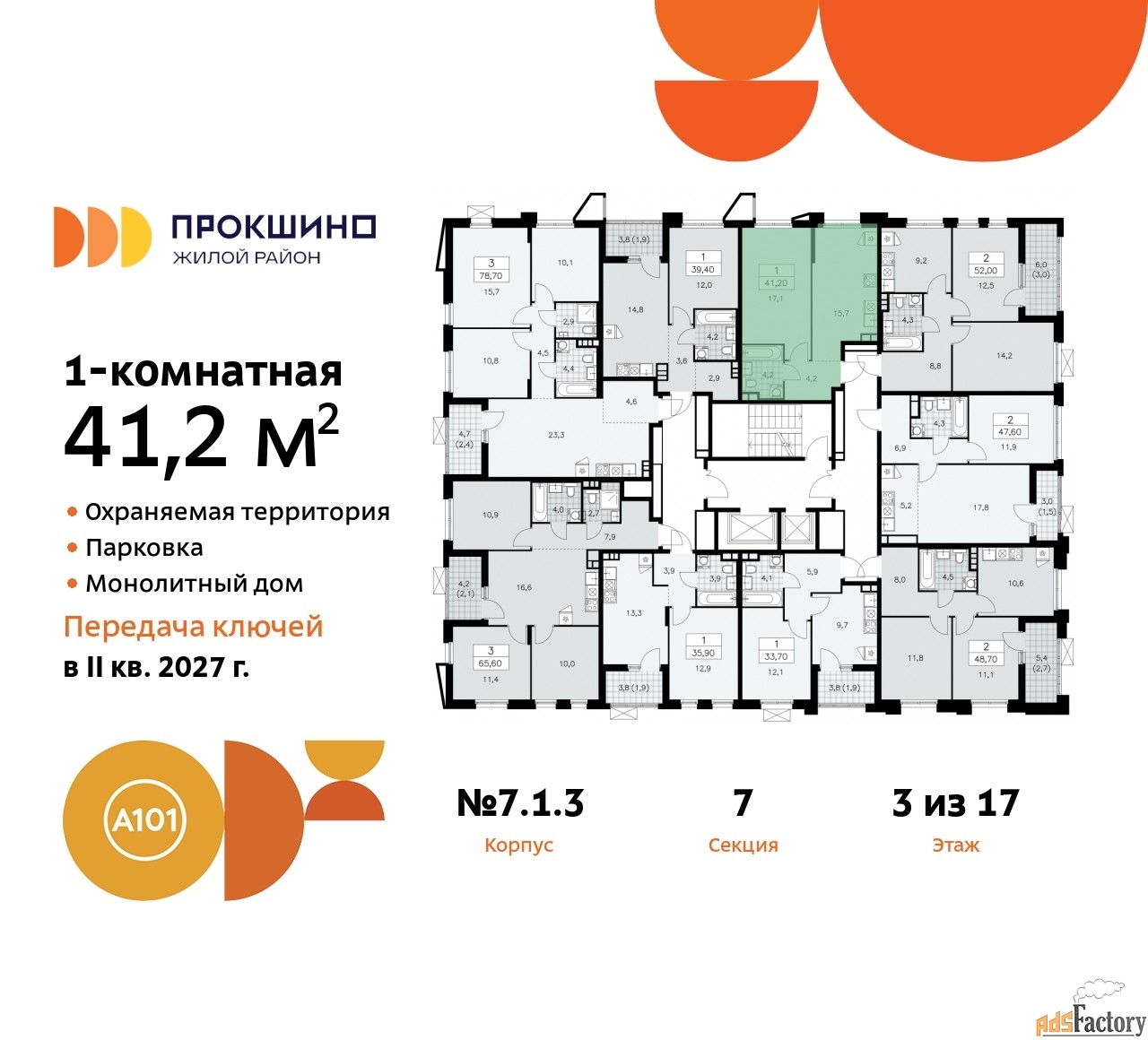 Квартира находится в корпусе 7.1.3. Дом монолитный, одноподъездный, высотой 17 этажей. На этаже 9 квартир. В подъезде 1 пассажирский и 1 грузовой лифт. Начало строительства - 4 квартал 2024 года. Окончание строительства - 2 квартал 2027 года. Оформление сделки по договору долевого участия.
