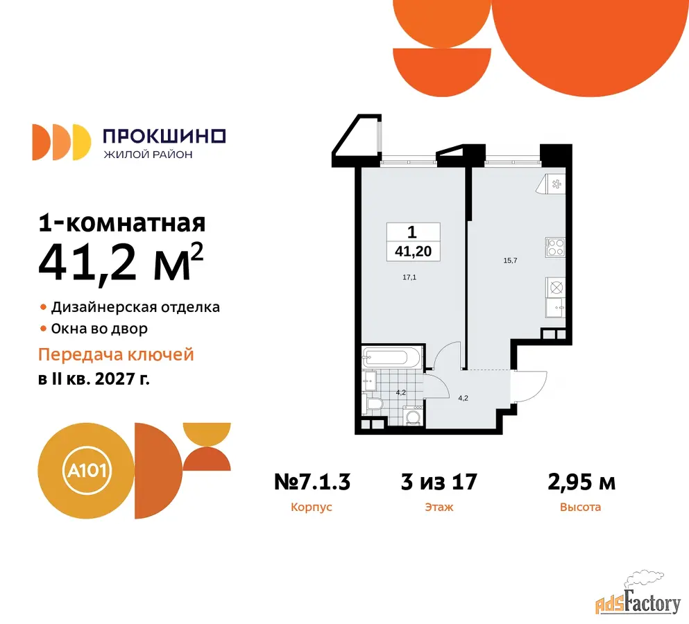 Квартира находится в корпусе 7.1.3. Дом монолитный, одноподъездный, высотой 17 этажей. На этаже 9 квартир. В подъезде 1 пассажирский и 1 грузовой лифт. Начало строительства - 4 квартал 2024 года. Окончание строительства - 2 квартал 2027 года. Оформление сделки по договору долевого участия.