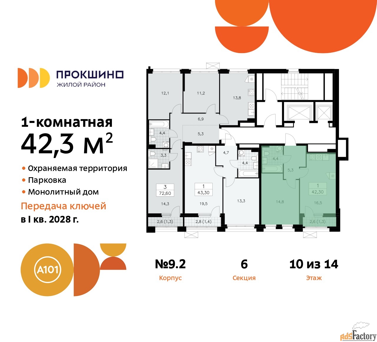 Дом монолитный, черырехподъездный, переменной этажности, от 10 до 14 этажей. Квартира находится в 4-й секции высотой 10 этажей в корпусе 9.2. На этаже 5 квартир. В подъезде 1 пассажирский и 1 грузовой лифт. Начало строительства - 3 квартал 2025 года. Окончание строительства - 4 квартал 2027 года. Оформление сделки по договору долевого участия.