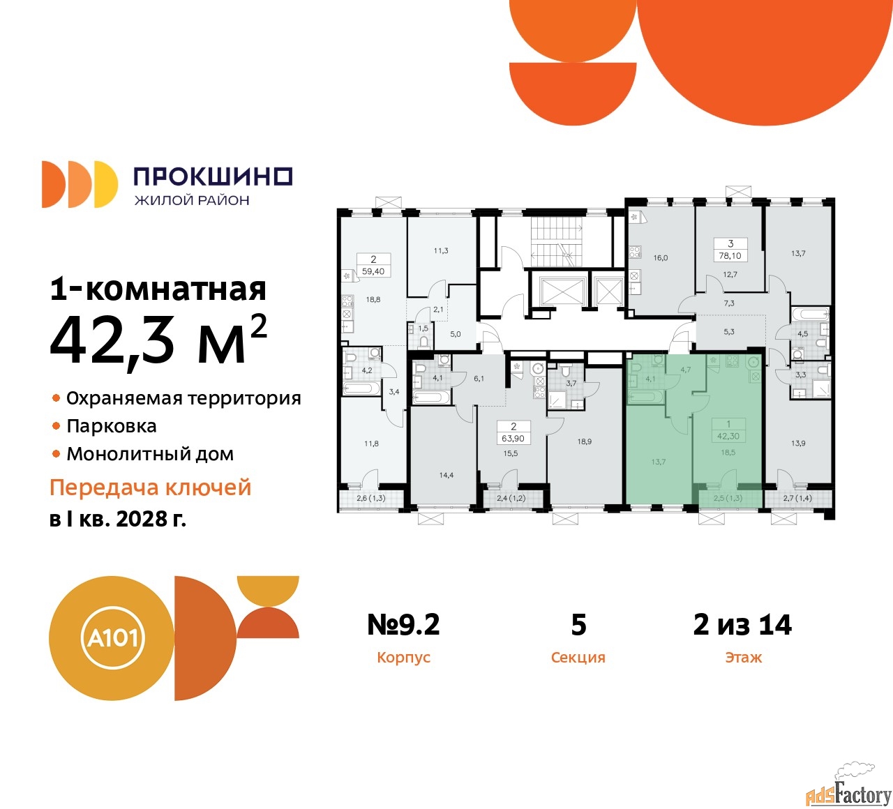 Дом монолитный, черырехподъездный, переменной этажности, от 10 до 14 этажей. Квартира находится в 3-й секции высотой 14 этажей в корпусе 9.2. На этаже 4 квартиры. В подъезде 1 пассажирский и 1 грузовой лифт. Начало строительства - 3 квартал 2025 года. Окончание строительства - 4 квартал 2027 года. Оформление сделки по договору долевого участия.