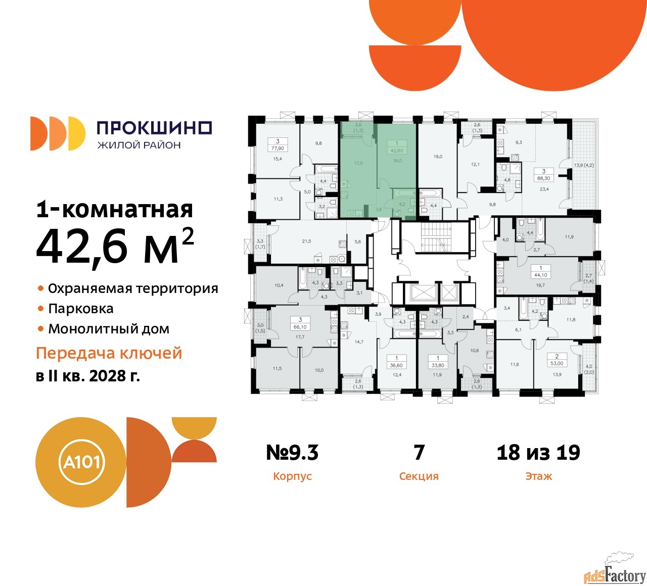 Квартира находится в корпусе 9.3. Дом монолитный, одноподъездный, высотой 19 этажей. На этаже 9 квартир. В подъезде 1 пассажирский и 1 грузовой лифт. Начало строительства - 3 квартал 2025 года. Окончание строительства - 4 квартал 2027 года. Оформление сделки по договору долевого участия.