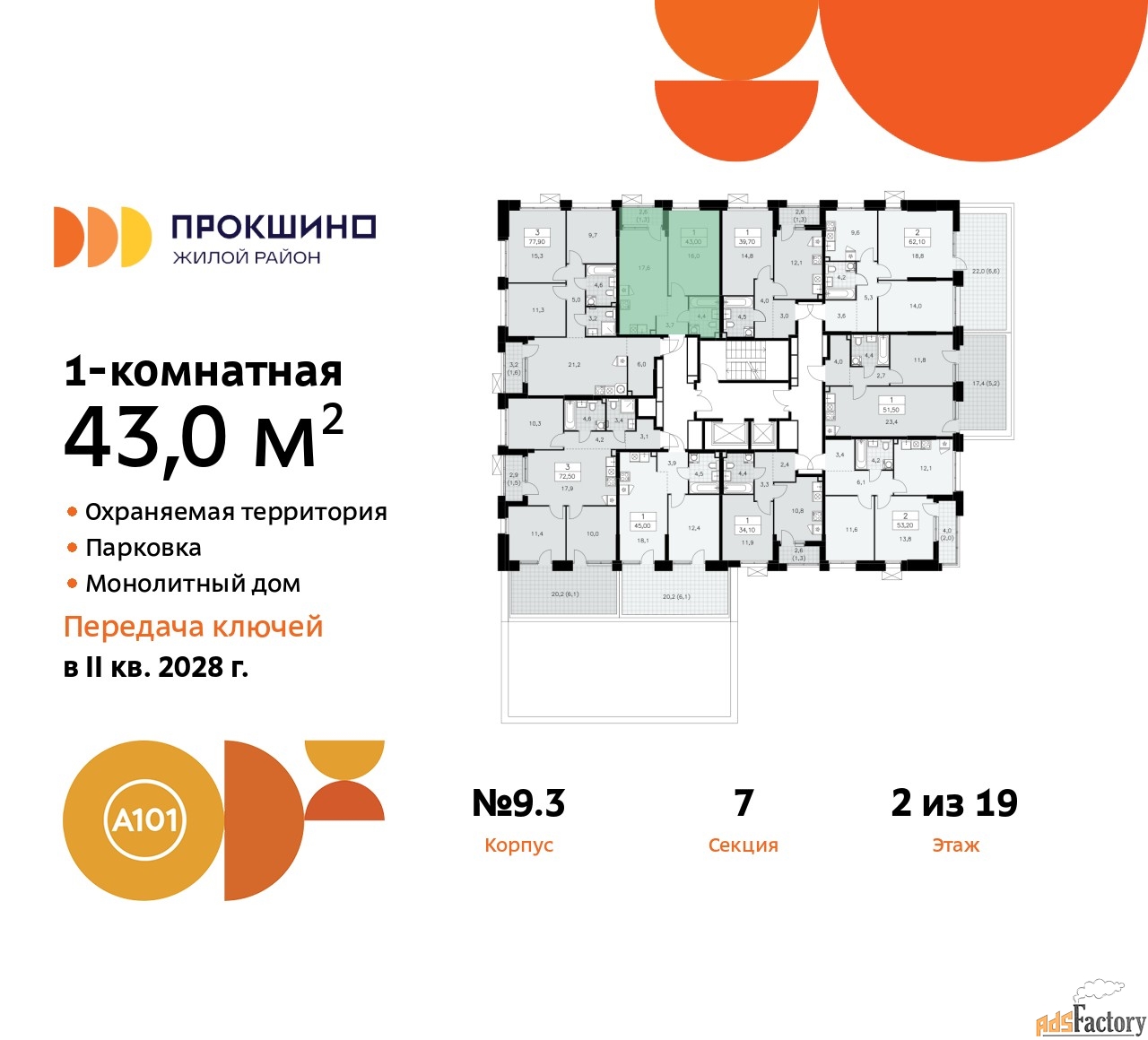 Квартира находится в корпусе 9.3. Дом монолитный, одноподъездный, высотой 19 этажей. На этаже 9 квартир. В подъезде 1 пассажирский и 1 грузовой лифт. Начало строительства - 3 квартал 2025 года. Окончание строительства - 4 квартал 2027 года. Оформление сделки по договору долевого участия.