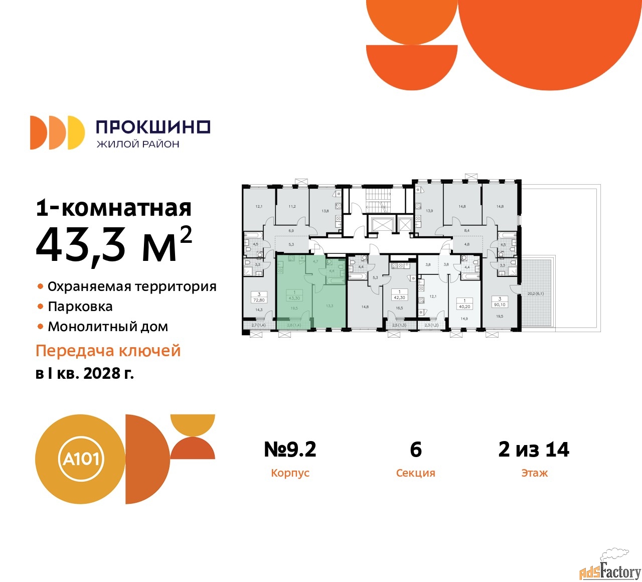 Дом монолитный, черырехподъездный, переменной этажности, от 10 до 14 этажей. Квартира находится в 4-й секции высотой 10 этажей в корпусе 9.2. На этаже 5 квартир. В подъезде 1 пассажирский и 1 грузовой лифт. Начало строительства - 3 квартал 2025 года. Окончание строительства - 4 квартал 2027 года. Оформление сделки по договору долевого участия.