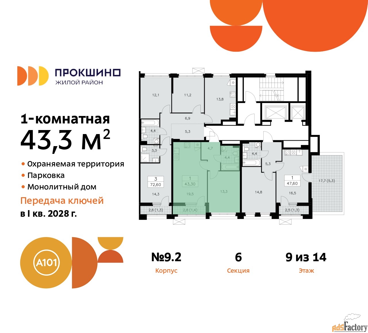 Дом монолитный, черырехподъездный, переменной этажности, от 10 до 14 этажей. Квартира находится в 4-й секции высотой 10 этажей в корпусе 9.2. На этаже 5 квартир. В подъезде 1 пассажирский и 1 грузовой лифт. Начало строительства - 3 квартал 2025 года. Окончание строительства - 4 квартал 2027 года. Оформление сделки по договору долевого участия.