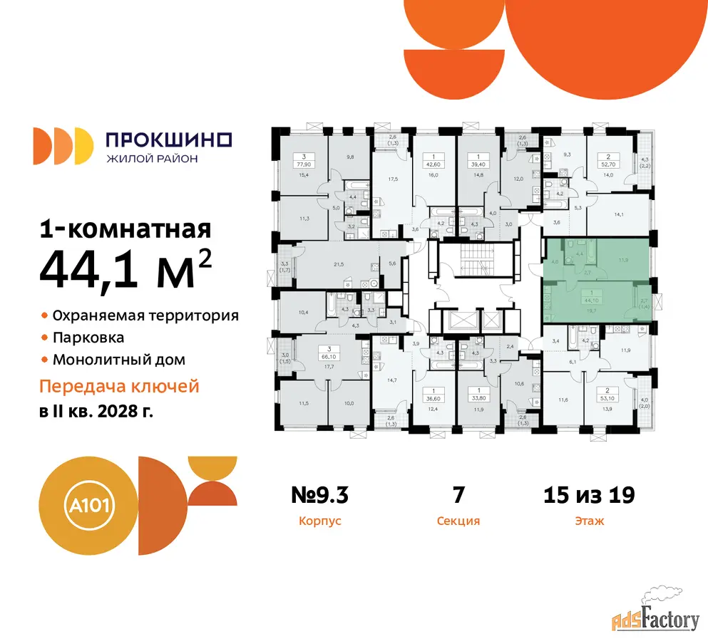 Квартира находится в корпусе 9.3. Дом монолитный, одноподъездный, высотой 19 этажей. На этаже 9 квартир. В подъезде 1 пассажирский и 1 грузовой лифт. Начало строительства - 3 квартал 2025 года. Окончание строительства - 4 квартал 2027 года. Оформление сделки по договору долевого участия.