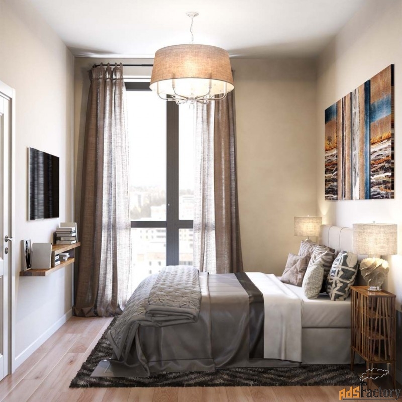 Эта квартира будет сдана с дизайнеркой отделкой «под ключ». Специально для проекта «Прокшино» разработаны два стиля дизайнерской отделки – в тёплых и холодных тонах. В отделке используются только современный высококлассные материалы, на все работы предоставляется гарантия. Имеется ниша под гардероб.