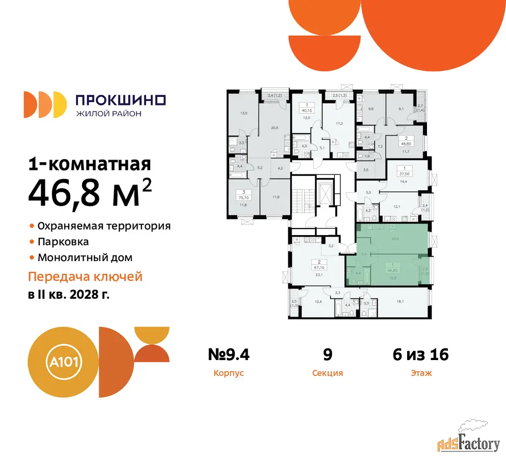Дом монолитный, черырехподъездный, переменной этажности, от 10 до 16 этажей. Квартира находится во 2-й секции высотой 10 этажей в корпусе 9.4. На этаже 6 квартир. В подъезде 1 грузовой лифт. Начало строительства - 3 квартал 2025 года. Окончание строительства - 4 квартал 2027 года. Оформление сделки по договору долевого участия.