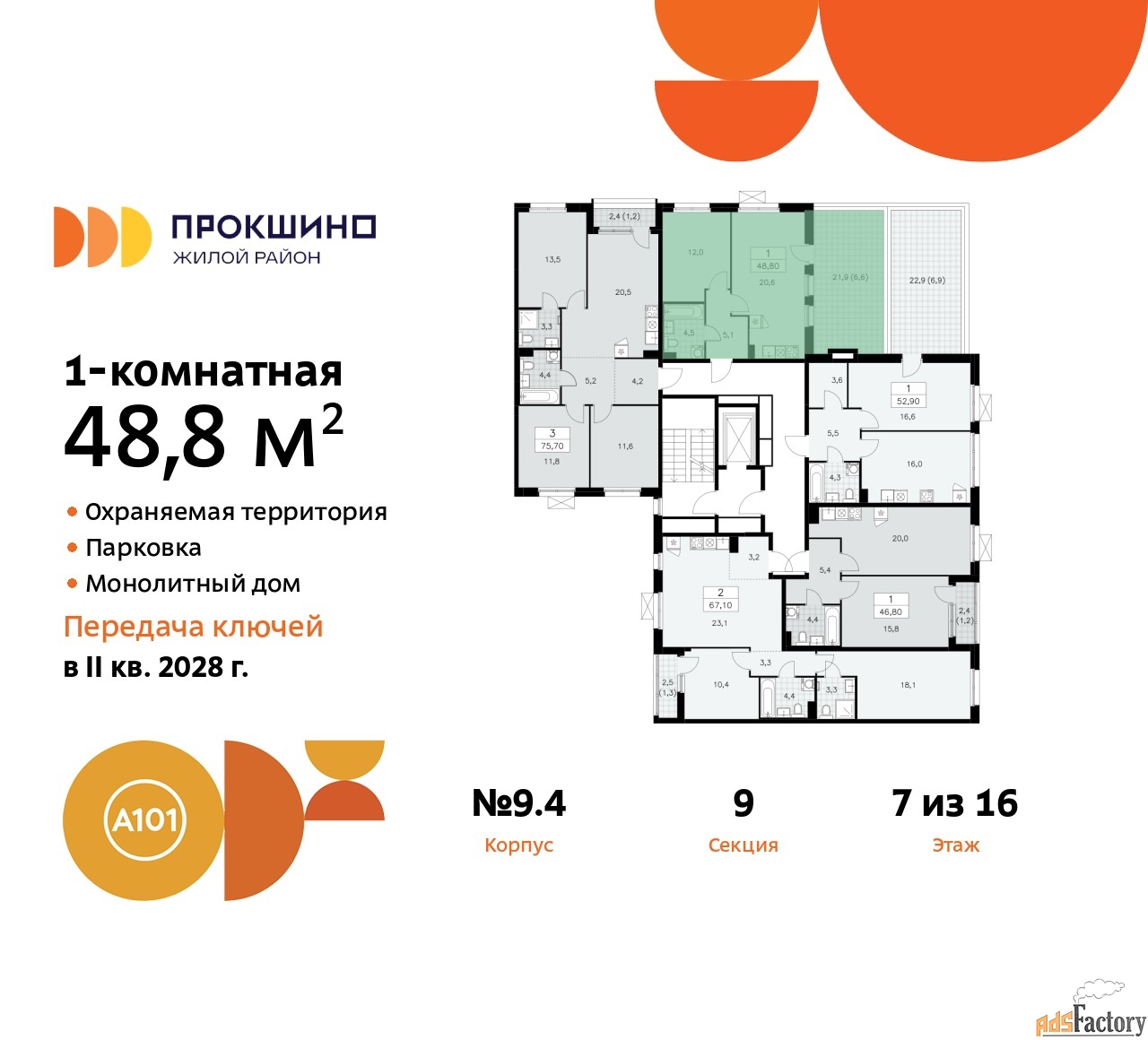 ЖК «Прокшино» расположен в 7,6 км от МКАД в Новой Москве. В 8 минутах пешком находится станция метро «Прокшино» быстрой и комфортной красной линии метро. Высокую транспортную доступность обеспечивают и два крупных шоссе, до которых легко доехать за 5 минут по новой скоростной автотрассе Солнцево – Бутово – Варшавское шоссе. Жилой комплекс «Прокшино» входит в кластер Прокшино. В районе появятся дома комфорт и бизнес-класса с подземным паркингом, закрытыми благоустроенными дворами без машин, местами для активного и созерцательного отдыха, магазинами, бытовыми сервисами и другими коммерческими объектами. Рядом пруд с собственной набережной и городской парк «Хованская дубрава». Для маленьких жителей построят детские сады, образовательный комплекс. (AQID02508861)