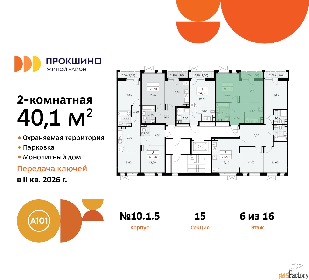 Дом монолитный, многоподъездный, переменной этажности, от 7 до 16 этажей. Квартира находится в 3-й секции высотой 7 этажей в корпусе 10.1.5. На этаже 5 квартир. В подъезде 1 грузовой лифт. Начало строительства - 2 квартал 2023 года. Окончание строительства - 2 квартал 2026 года. Оформление сделки по договору долевого участия.