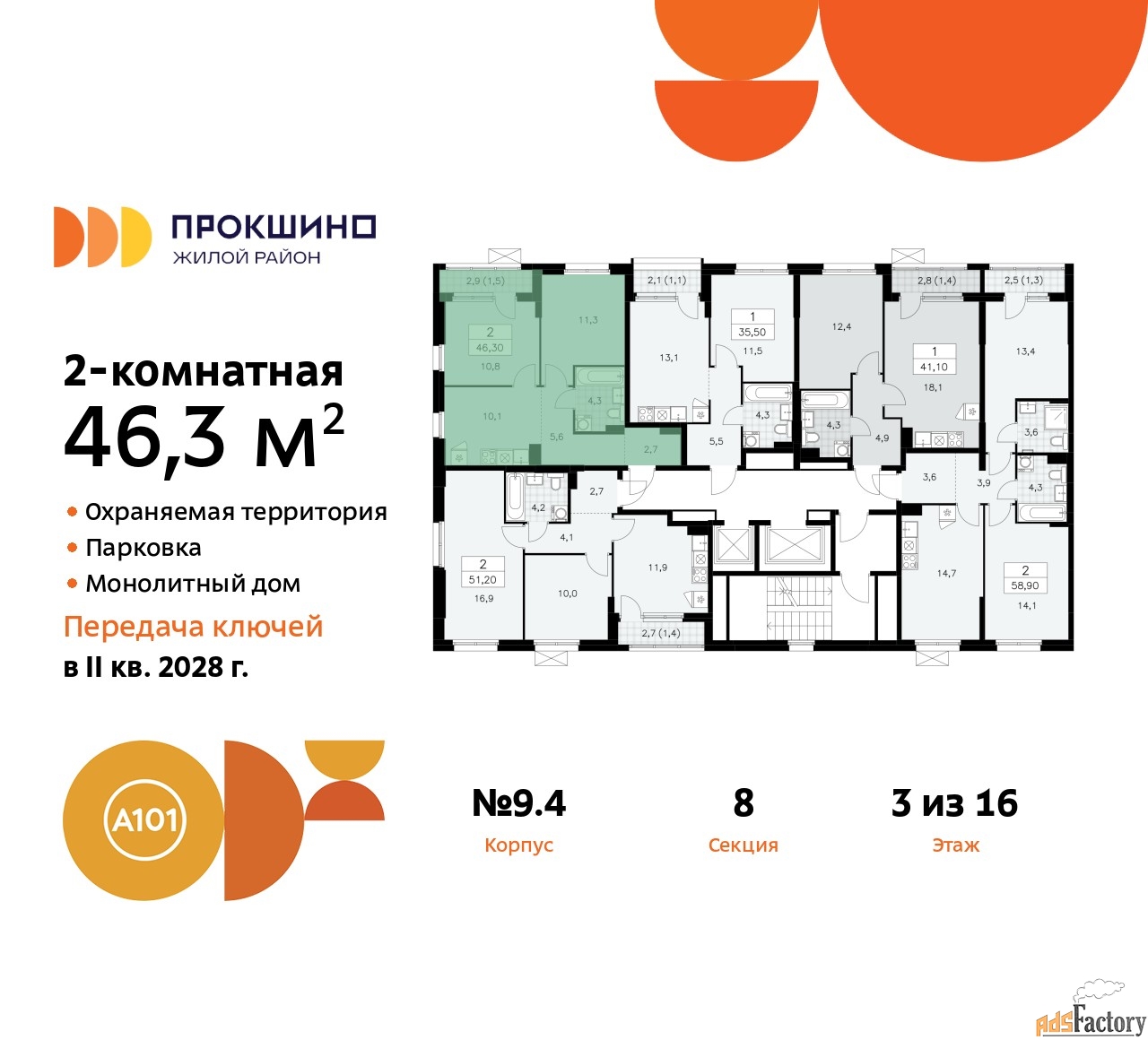 Дом монолитный, черырехподъездный, переменной этажности, от 10 до 16 этажей. Квартира находится в 1-й секции высотой 16 этажей в корпусе 9.4. На этаже 5 квартир. В подъезде 1 пассажирский и 1 грузовой лифт. Начало строительства - 3 квартал 2025 года. Окончание строительства - 4 квартал 2027 года. Оформление сделки по договору долевого участия.