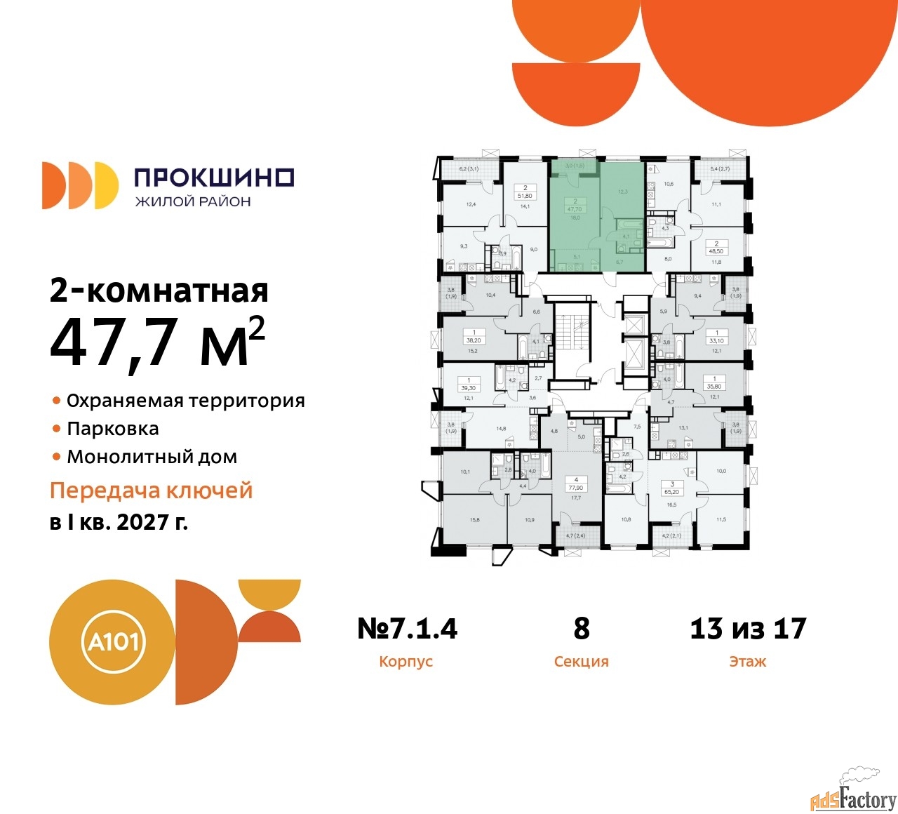 Квартира находится в корпусе 7.1.4. Дом монолитный, одноподъездный, высотой 17 этажей. На этаже 9 квартир. В подъезде 1 пассажирский и 1 грузовой лифт. Начало строительства - 4 квартал 2024 года. Окончание строительства - 1 квартал 2027 года. Оформление сделки по договору долевого участия.