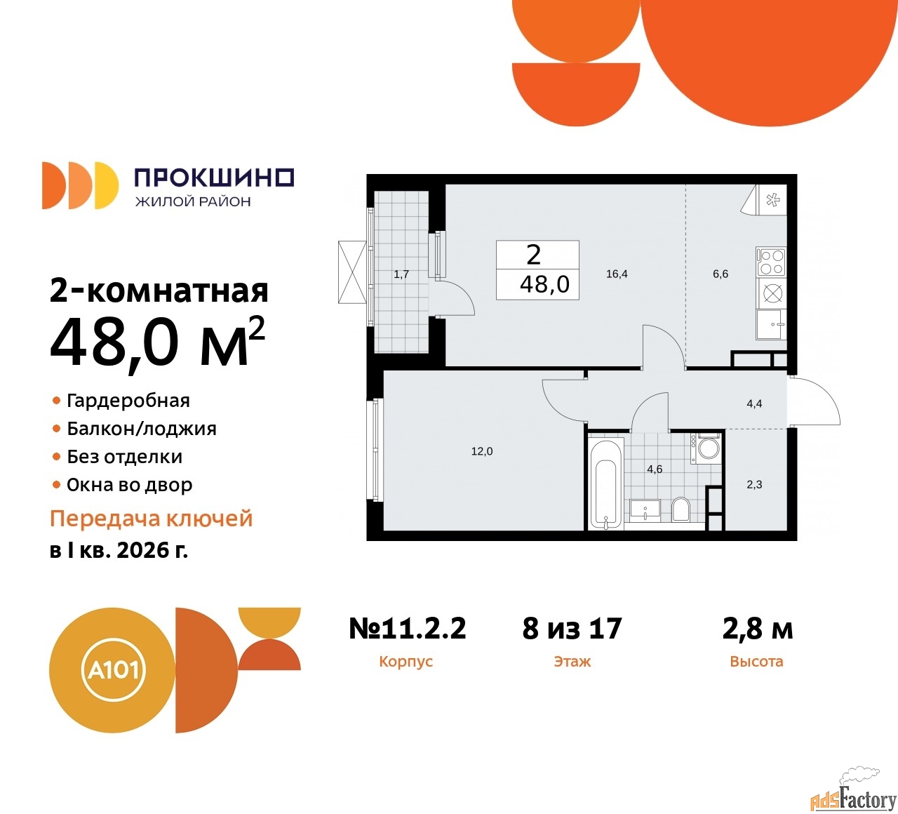 Квартира находится в корпусе 11.2.2. Дом монолитный, одноподъездный, высотой 17 этажей. На этаже 9 квартир. В подъезде 1 пассажирский и 1 грузовой лифт. Начало строительства - 3 квартал 2023 года. Окончание строительства - 1 квартал 2026 года. Оформление сделки по договору долевого участия.