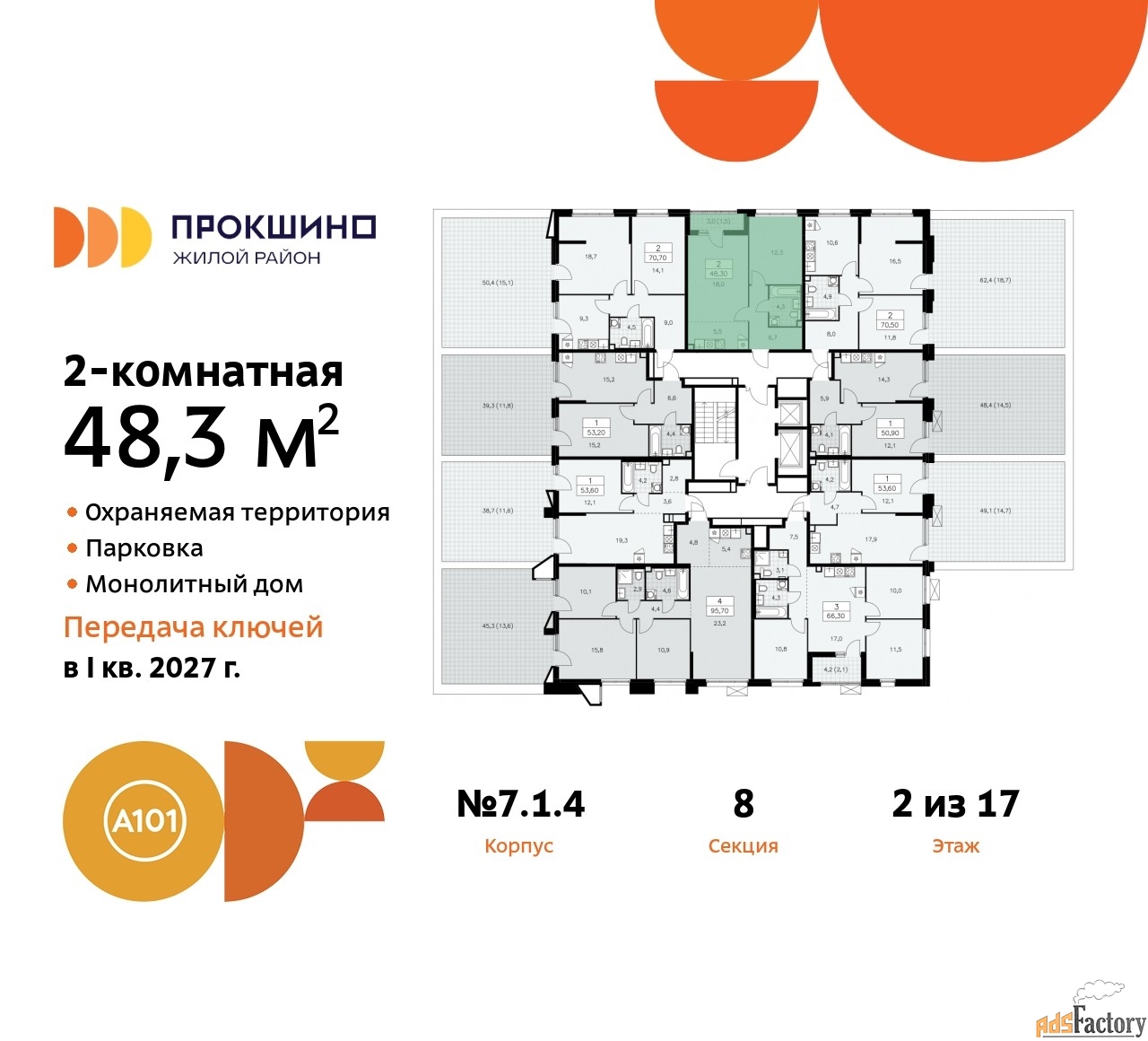 Квартира находится в корпусе 7.1.4. Дом монолитный, одноподъездный, высотой 17 этажей. На этаже 9 квартир. В подъезде 1 пассажирский и 1 грузовой лифт. Начало строительства - 4 квартал 2024 года. Окончание строительства - 1 квартал 2027 года. Оформление сделки по договору долевого участия.