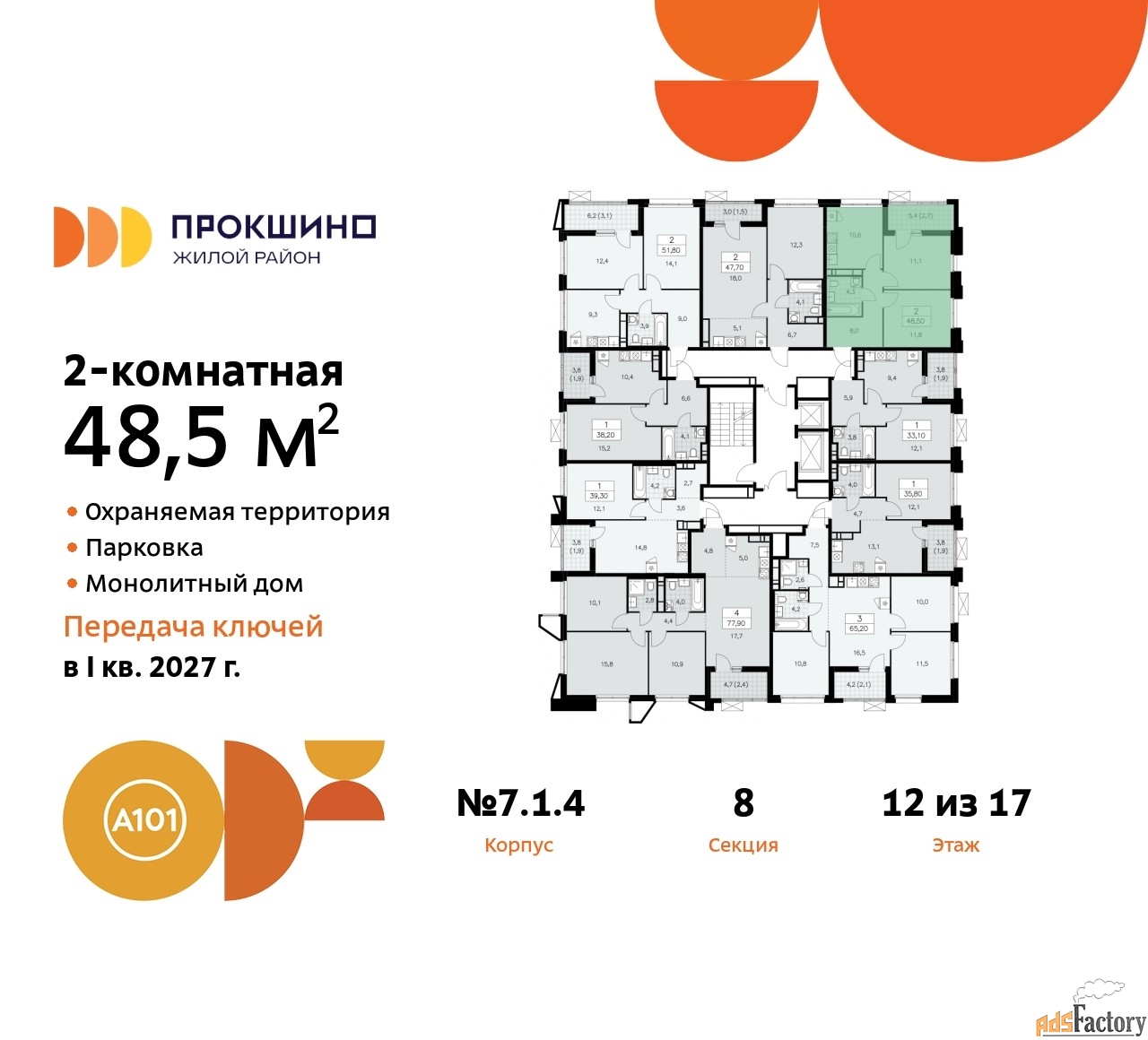 Квартира находится в корпусе 7.1.4. Дом монолитный, одноподъездный, высотой 17 этажей. На этаже 9 квартир. В подъезде 1 пассажирский и 1 грузовой лифт. Начало строительства - 4 квартал 2024 года. Окончание строительства - 1 квартал 2027 года. Оформление сделки по договору долевого участия.