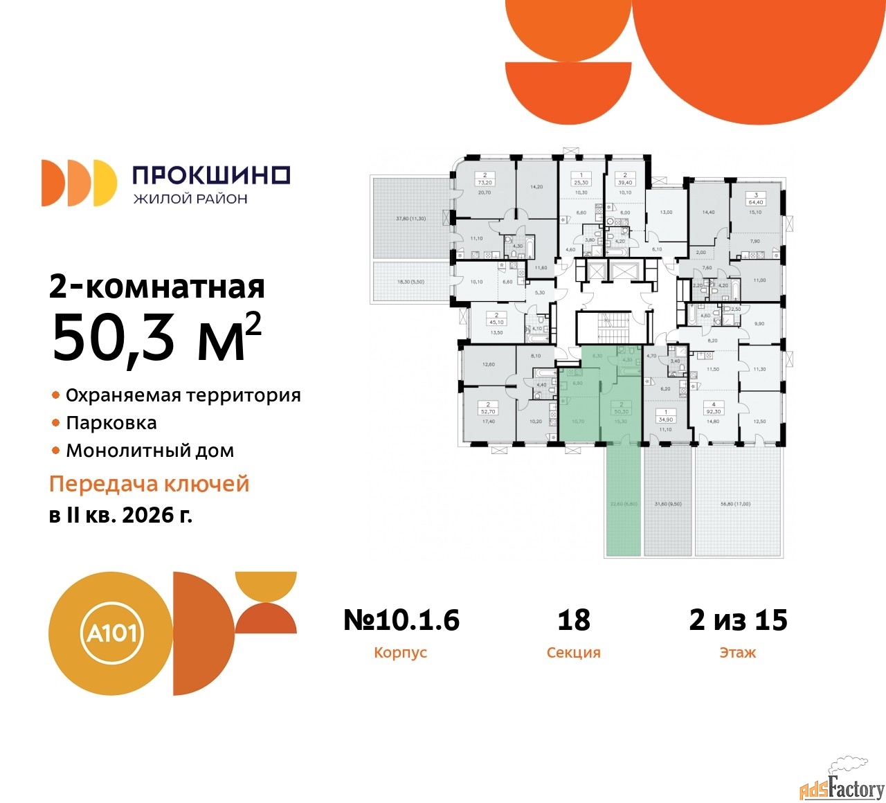 Квартира находится в корпусе 10.1.6. Дом монолитный, одноподъездный, высотой 15 этажей. На этаже 9 квартир. В подъезде 1 пассажирский и 1 грузовой лифт. Начало строительства - 2 квартал 2023 года. Окончание строительства - 2 квартал 2026 года. Оформление сделки по договору долевого участия.