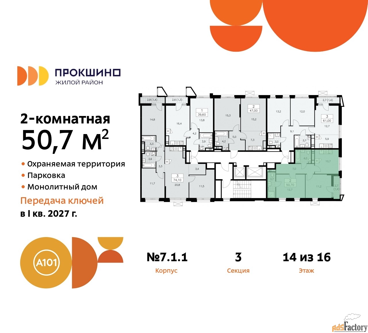 Дом монолитный, трехподъездный, переменной этажности, от 12 до 16 этажей. Квартира находится в 3-й секции высотой 16 этажей в корпусе 7.1.1. На этаже 5 квартир. В подъезде 1 пассажирский и 1 грузовой лифт. Начало строительства - 4 квартал 2024 года. Окончание строительства - 1 квартал 2027 года. Оформление сделки по договору долевого участия.