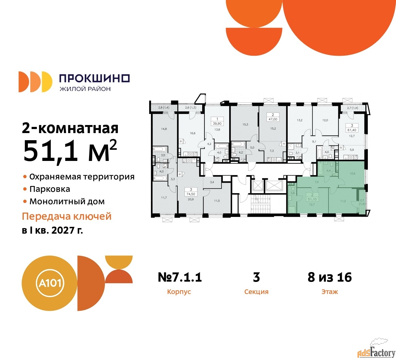 Дом монолитный, трехподъездный, переменной этажности, от 12 до 16 этажей. Квартира находится в 3-й секции высотой 16 этажей в корпусе 7.1.1. На этаже 5 квартир. В подъезде 1 пассажирский и 1 грузовой лифт. Начало строительства - 4 квартал 2024 года. Окончание строительства - 1 квартал 2027 года. Оформление сделки по договору долевого участия.